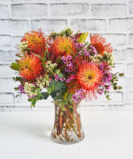 Warm and grounding, this arrangement captures the quiet beauty of day's end with vibrant protea, soft seasonal blooms, and rich greenery. It evokes the golden hues and calm stillness of a setting sun—perfect for bringing a touch of nature’s glow into any space.